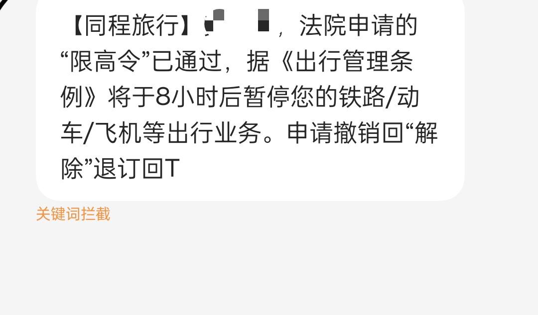 收到同程旅行的短信发来说法院申请限高令通过同程旅行通知您,关于您的消费信贷或相关协议,法院已批准限高令。这意味着您的消费能力受到限制,可能与未偿还债务有关。请您重视,尽快处理相关债务或联系同程旅行了解详情。... 2025-04-03 - [阅读全文]